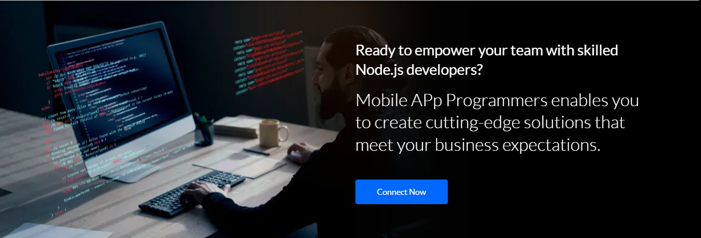 Ready to transform your vision into reality? Partner with Mobile App Programmers and unlock the full potential of Node.js for your business. Whether you're looking to build a scalable web application, a real-time chat platform, or a robust backend system, we have the expertise and experience to make it happen. Node.js developers for all your web app development needs. Schedule a call now !