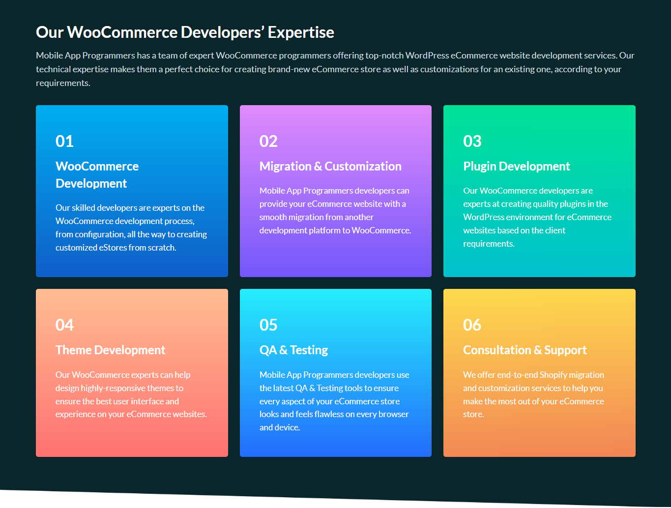 we are commited to excellence, professionalism, and customer-centric approach. With over 14+ years of experience in the industry, they have honed our skills and expertise to provide their clients with reliable, efficient, and future-proof WooCommerce solutions. Mobile App Programmers - WooCommerce Development Services with a creative mindset to create online stores that are both aesthetically pleasing and incredibly functional.